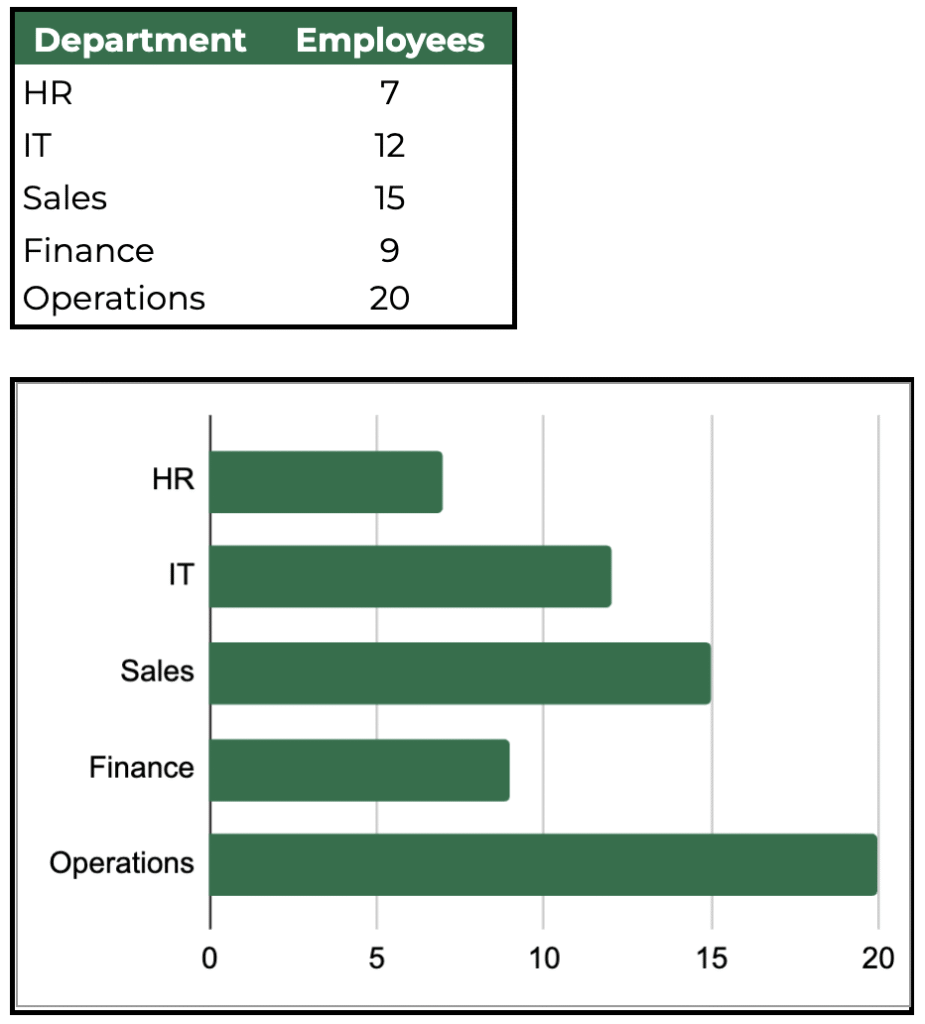 Use for: Comparing values horizontally, often when labels are long or you’re working with a crowded dataset. Bar charts show which department is largest or which category dominates, making them especially helpful for staff breakdowns, budgets, or rankings.