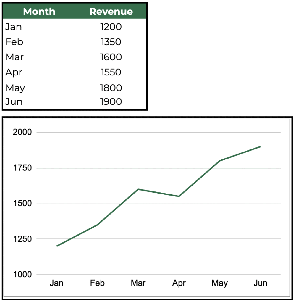 Use for: Tracking changes, trends, and dynamics over time. Line charts are your go-to for monthly revenue, web traffic, or temperature readings. They help viewers connect dots and see how variables evolve—highlighting growth spurts, dips, and outlier months.