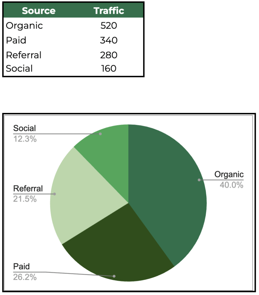 Use for: Showing how each slice contributes to the whole. Pie charts are effective for visualizing percentages, shares, or proportions—such as sources of website traffic or budget allocations. They’re quick and eye-catching, but best with up to five slices.