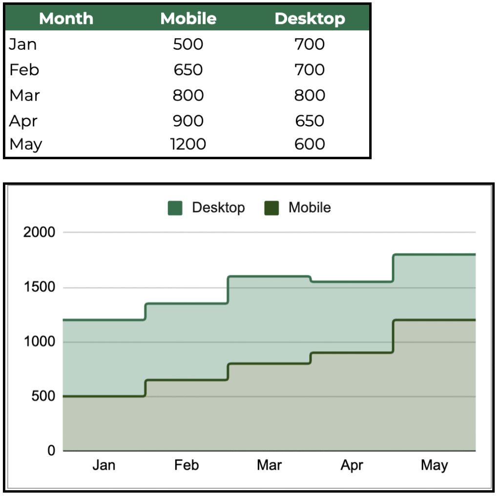 Use for: Displaying cumulative totals or stacked trends over time. Use area charts to compare different segments—like mobile vs desktop visits, or profit and expenses across months. They highlight both the overall volume and each category’s contribution.