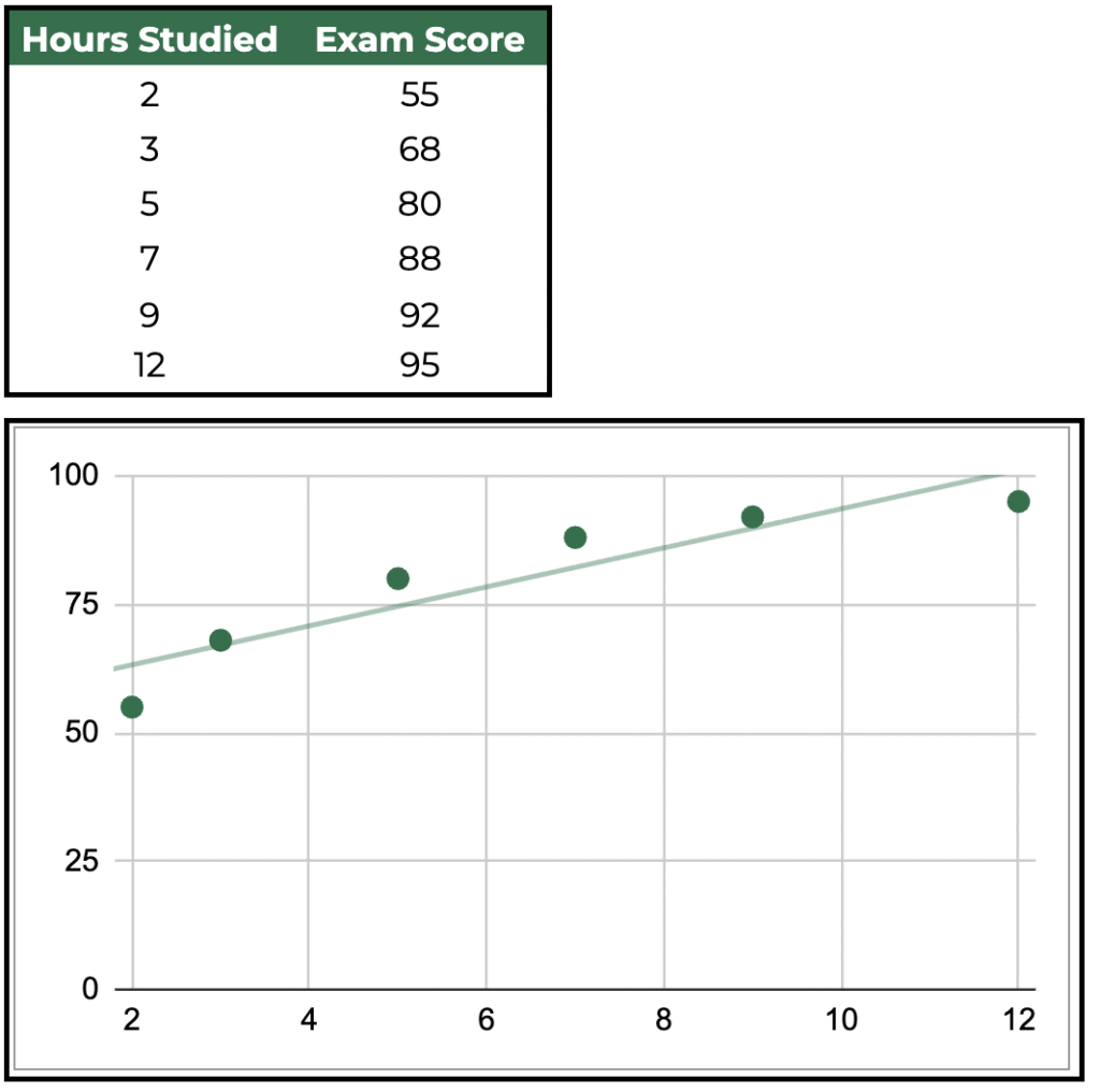 Use for: Analyzing correlation between two numeric variables. Scatter charts are best when asking, “Does X influence Y?” For example, plotting study hours against scores shows the relationship and potential trend.