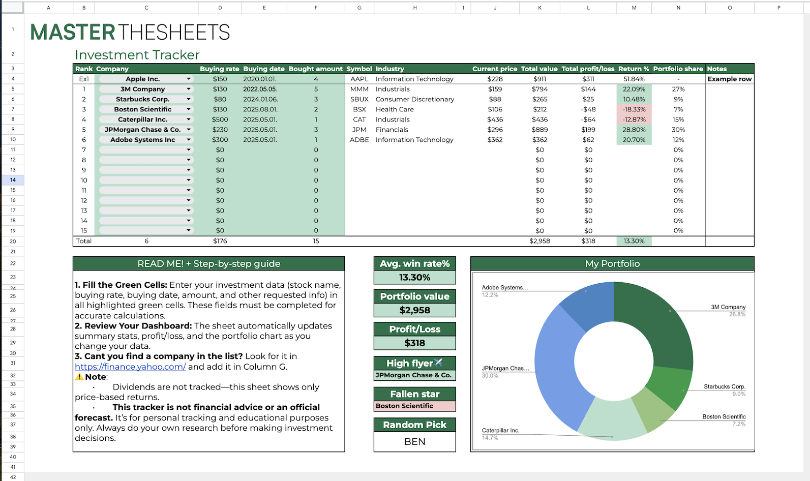 Just fill in the highlighted green cells with your data and instantly see live profit/loss, returns, and portfolio allocation.